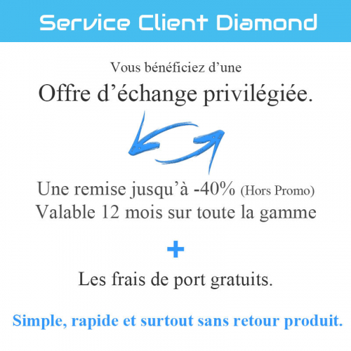 Offre d'échange privilégiée : Vous bénéficiez sur tous les produits Diamond d'une offre d'échange privilégiée, une remise jusqu'à -40% et de frais de port gratuit, ce pendant 12 mois. Une démarche simplifiée, ultra rapide, livraison Express 48H Gratuite et surtout sans retour produit, votre écran reste toujours protégé.