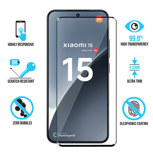 Version " Full Cover " : Un nouveau design incurvé quasi invisible, une véritable vitre de protection avec bordure noire pour une couverture intégrale du protège écran Xiaomi 15.